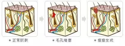 皮脂腺分泌的皮脂过多,引起毛囊导管堵塞,同时游离脂肪酸影响了角质细胞的分化,加重毛孔堵塞,然后毛囊里的痤疮杆菌就开始作妖,大肆繁殖,引起皮肤免疫系统来调动炎症细胞因子抵御这些细菌,炎症出现,形成毛囊炎,就出现了痘痘。
