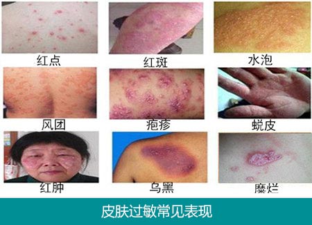 红疹子:这是皮肤过敏症状中典型的,刚开始是脸颊上或者是额头上出现一些红疹子,但是慢慢的红疹子会增加,后蔓延到整个脸部。