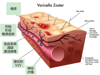水痘~带状疱疹病毒经呼吸道黏膜进入血液形成病毒血症,发生水痘或呈隐性感染,以后病毒可长期潜伏在脊髓后根神经节或者颅神经感觉神经节内。当机体抵抗力下降时,潜伏病毒被激活,沿感觉神经轴索下行到达该神经所支配区域的皮肤内复制产生水疱,同时受累神经发生炎症、坏死,产生神经痛。